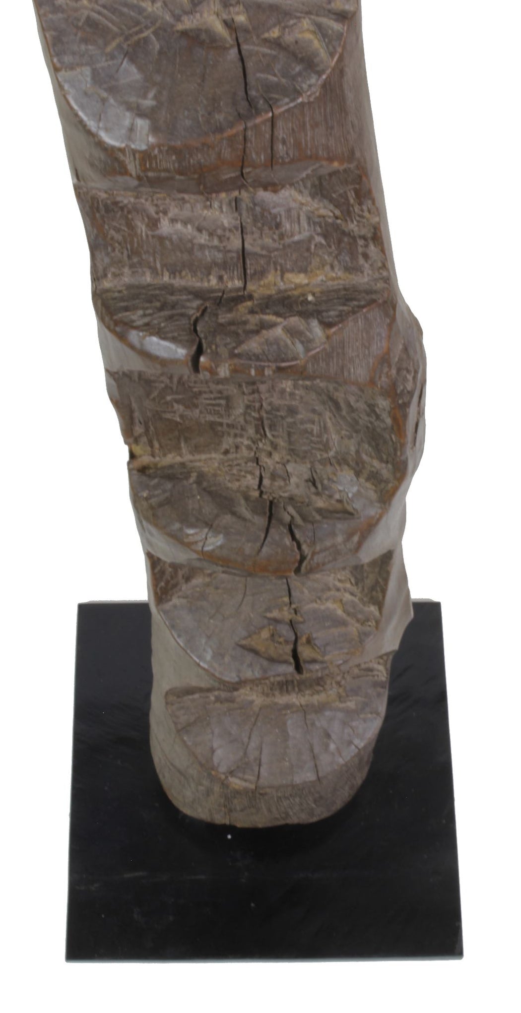 These genuine, used sculptural objects are still commonly in use today by many people in the Dogon country of Mali. The longer ones are used to reach the roof of a house; the shorter ones to access thatch-topped adobe granaries. Many are also still in use among other tribal groups, including the Lobi of Ivory Coast and the Somba (or Tamberma) of Togo. We have these types as well. This ladder is among the most beautiful: the oldest, most used. Most evident of its age and use is the appearance of patina, which covers nearly the entire front facing part of the ladder, which is quite rare. Patina is even evident on the back of the ladder in isolated areas, which not only shows how it was carried, but also that it was quite stationary for most of its use. Patina only comes from human skin, specifically, the hands and feet. Some are free-standing, mounted on iron bases; some are un-mounted. Towards the base of this ladder it appears to have evidence of bug intrusions, which is common among all old African items that sit on the ground.