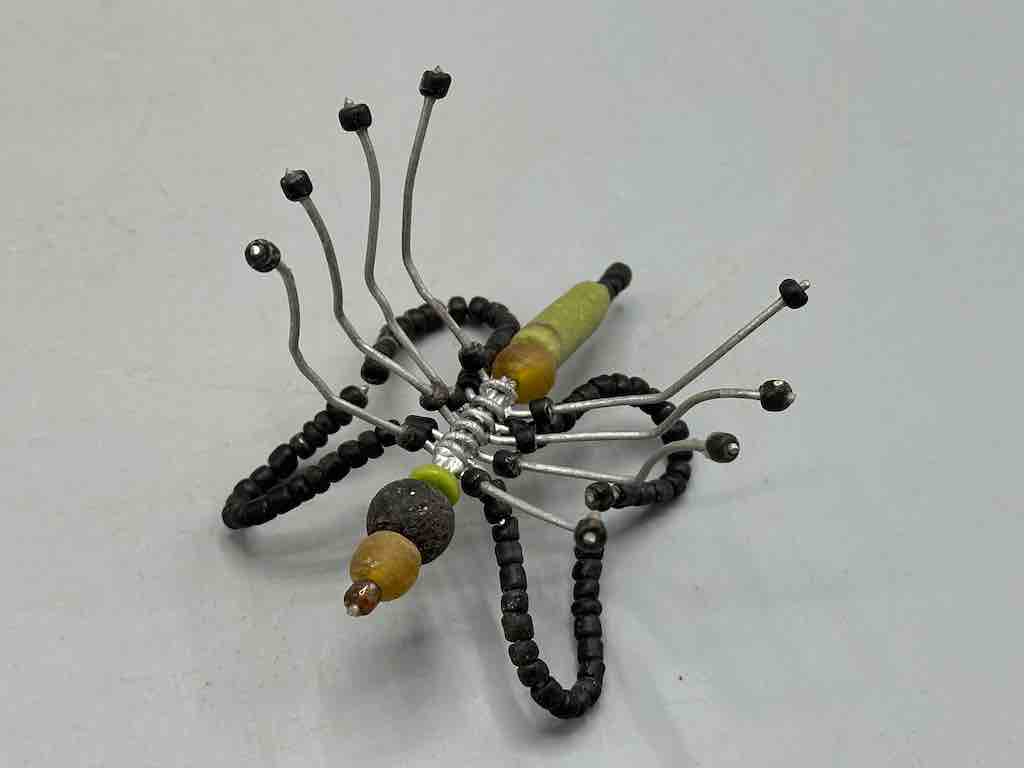 This unique one-of-a-kind beaded wire butterfly is part of the movement of contemporary African art sweeping the Continent. This one showcases the work of the artist known as "Tet". This butterfly features 5 handmade olive green, yellow & black African powder glass beads and recycled wire. The smallest black beads, forming the wings, feet and tail, appear also to be African and handmade but I'm not sure. The African beads, also called "sandcast" beads - are modern versions of the traditional low-fire bead making process which has proliferated recently in Ghana. Tet's creativity is reflected in a large variety of beads of this type; he has chosen these spiders as one more way to exhibit his skill.
