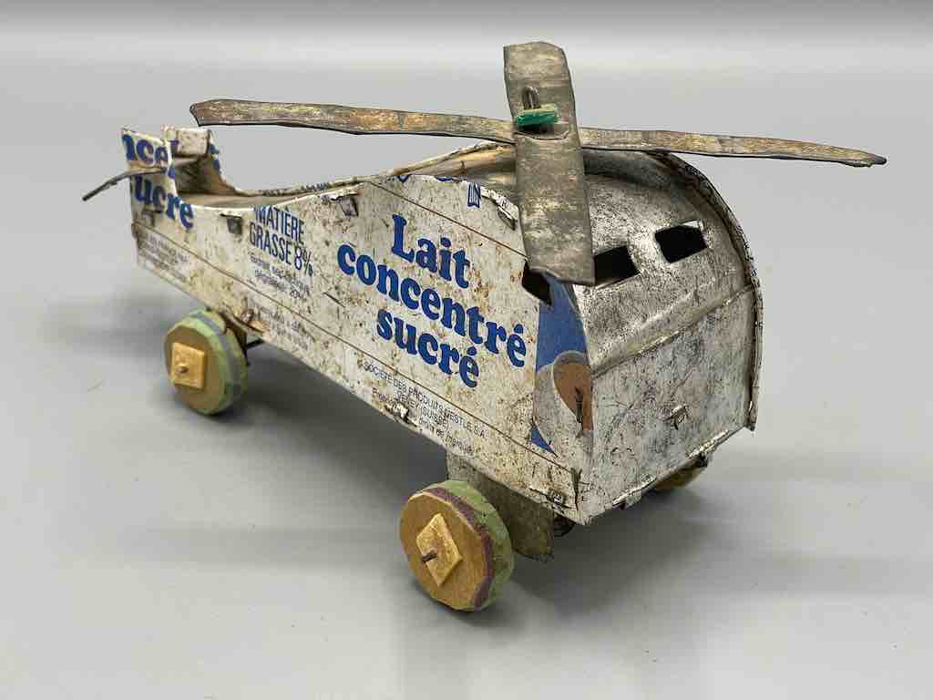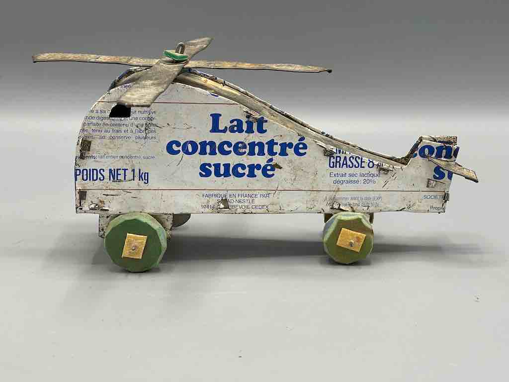 Traditionally, all children in Africa make their own toys out of found materials: discarded cans, wire, old sandals, tires, etc. Following this long-standing tradition modern artists are creating art in all kinds of forms. This helicopter was made by such an artist but it could have been a toy a child might have made for him or herself. Each toy of this style is unique so it may vary slightly from the one pictured here.