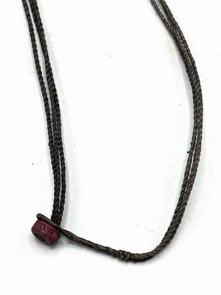 Each cord of this long triple-strand necklace is of finely twisted black leather and features a traditional African ball and loop closure. Onto it we have strung a single small brass sawfish gold weight pendant. The leather is made from goatskin. Each small brass fish gold weight pendant is individually hand cast using the traditional lost wax casting method so no two are exactly alike.