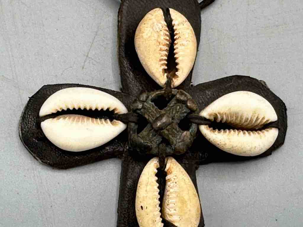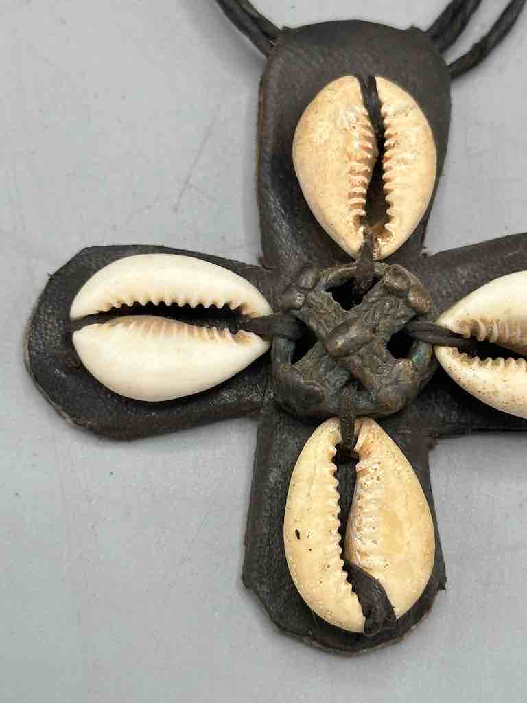 This triple strand twisted black leather necklace features a centerpiece black leather pendant in the shape of a cross adorned with natural cowrie shells and a single vintage round gold weight in the center. Necklaces of this type are worn by tribal people of Mali for protective purposes, as well as personal adornment. The leather is made from goatskin. Such a necklace is imbued by tribal healers with medicinal or spiritual value which defend the wearer from whatever he or she may consider to be threatening to them. Each vintage brass gold weight was individually hand cast many years ago using the traditional lost wax casting method so no two are exactly alike.