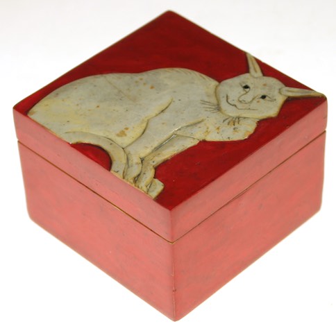 This box measures 6 x 6 x 4 cm (2.4 x 2.4 x 1.6") We offer this box in 4 variations: a White Cat on either a Black or Red background and a Black Cat on either a Tan or Red background.