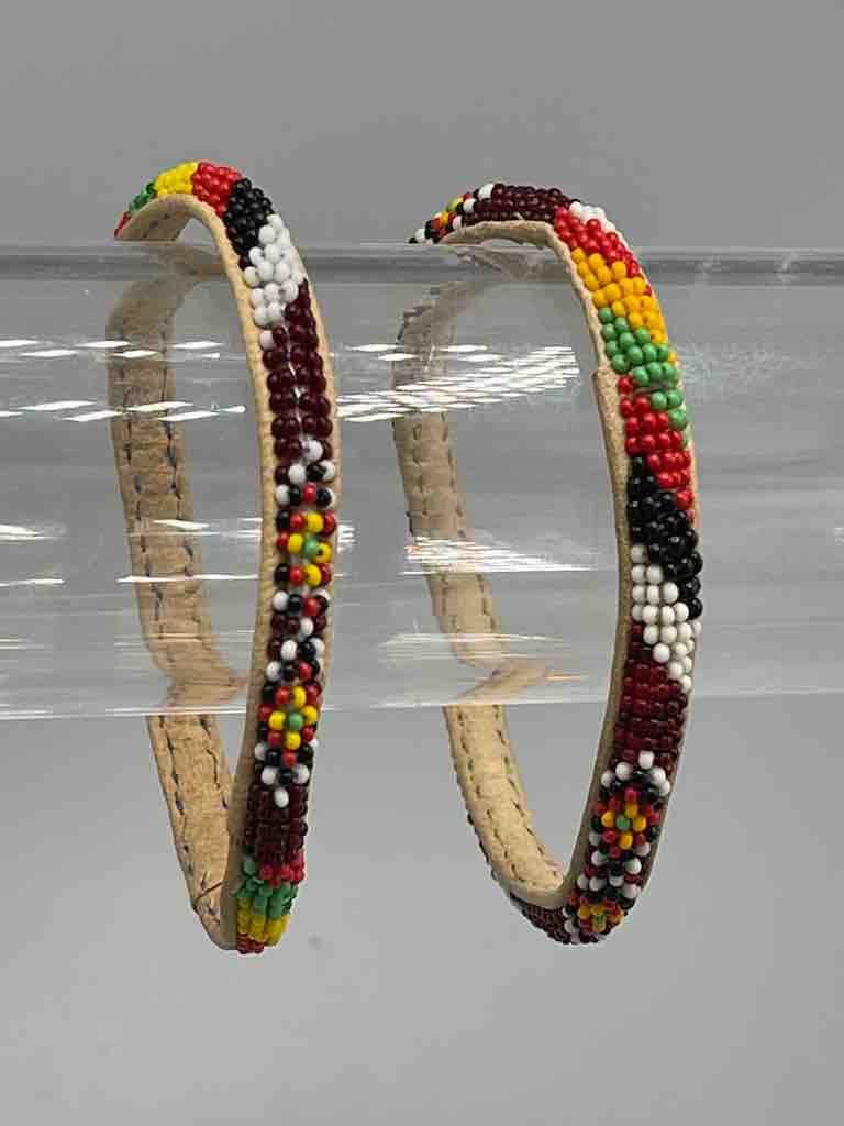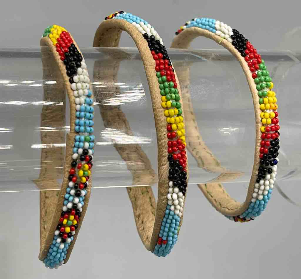 These beaded leather bracelets are available in 12 different color/designs plus a few miscellaneous ones, all beaded on natural goat leather. The beads are among the smallest used in the wide range of other similar beaded bracelets made in other African countries. However they are not as tiny as those used in the finest narrowest, most exclusive beaded bracelets like those we sell under the SKU BBR-10F, available here on our store. These are made in Mauritania.
