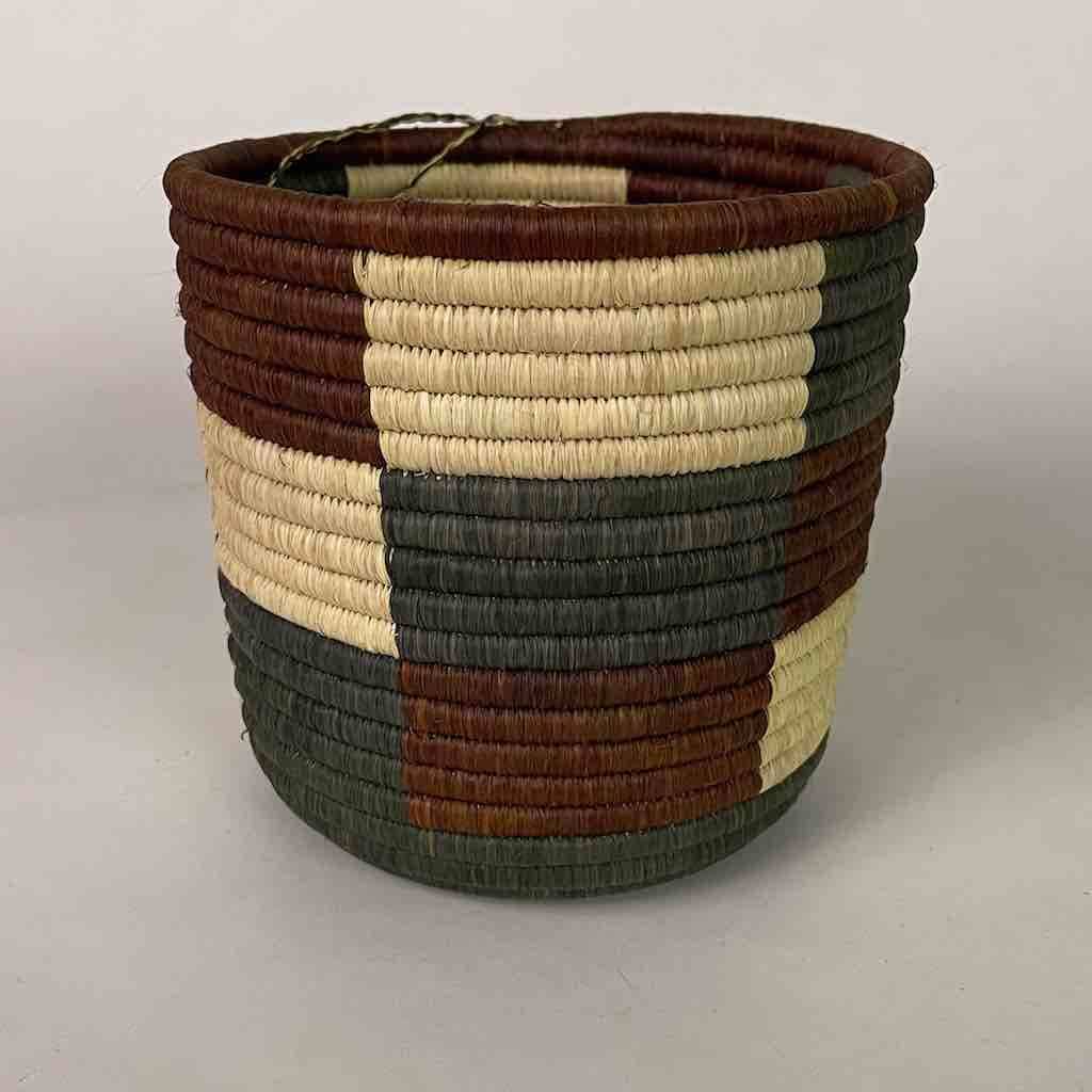These Batwa baskets feature raffia wrapped coils in a contemporary checkerboard design. The Batwa - the Twa people, a “pygmy” people - live in the border area of southwestern Uganda, northwestern Rwanda and eastern Congo, in the area of the Ruwenzori Mountains, in the Bwindi Impenetrable Forest. They live among a native gorilla population just like we live among whitetail deer. 5” tall x 4 5/8” top diameter.
