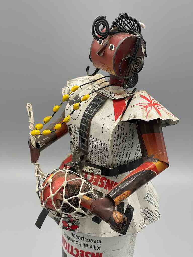 Traditionally, all children in Africa make their own toys out of found materials: discarded cans, wire, old sandals, tires, etc. Following this long-standing tradition modern artists in Mali are creating art in all kinds of forms. This one of a kind statue was made by such an artist, confirming the importance of contemporary art in modern Africa.