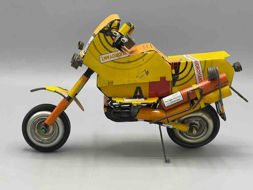 Traditionally, all children in Africa make their own toys out of found materials: discarded cans, wire, old sandals, tires, etc. Following this long-standing tradition modern artists are creating art in all kinds of forms. These motorcycles were made by such artists but could have been toys a child might have made for himself. This motorcycle toy was made from Yotox insecticide cans. Each toy of this style is unique so it may vary slightly from the one pictured here.