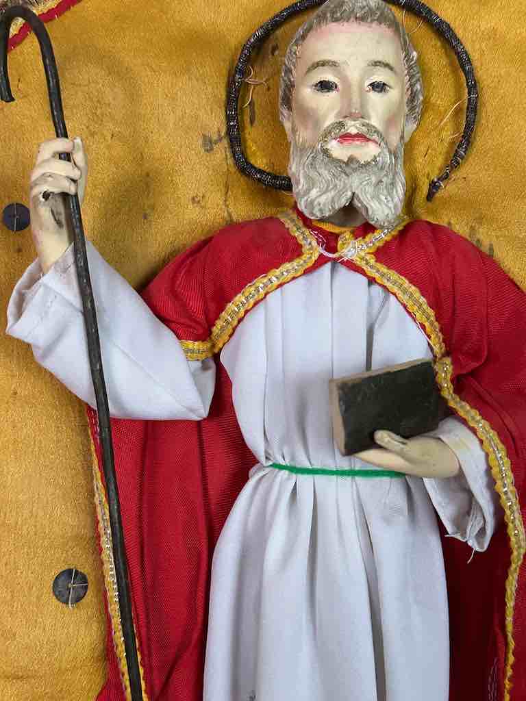 This vintage Vietnamese Catholic banner features a central figure of Saint Joseph holding a Bible and a crook. His head, hands & shoes are hand-carved wood. The banner is silk, intricately embroidered with a variety of floral designs of silk threads in a range of colors. Although not in perfect condition it is in an excellent state of wear considering its age.