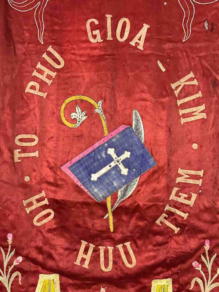 The embroidery on the back of the banner features the year 1961 which dates this to that year. The words translate to "Patriarch Giao-KIM, Huu Tiem Lake"