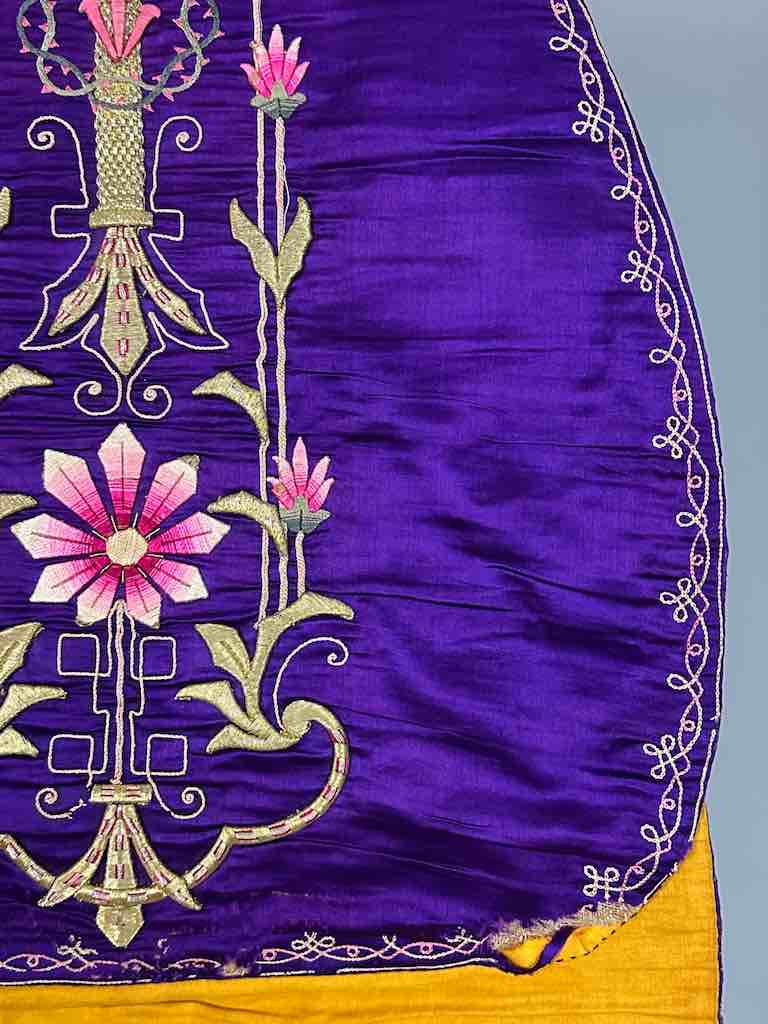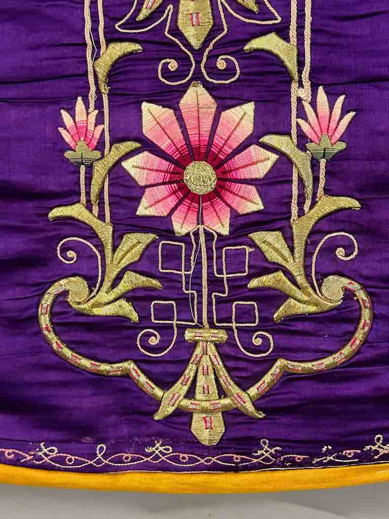 This vintage Vietnamese Catholic purple silk chasuble features a central cross with a spread-wing bird in the middle nurturing 3 babies and a beautiful variety of intricately woven floral designs, of gilded & silver metallic threads together with silk embroidery.