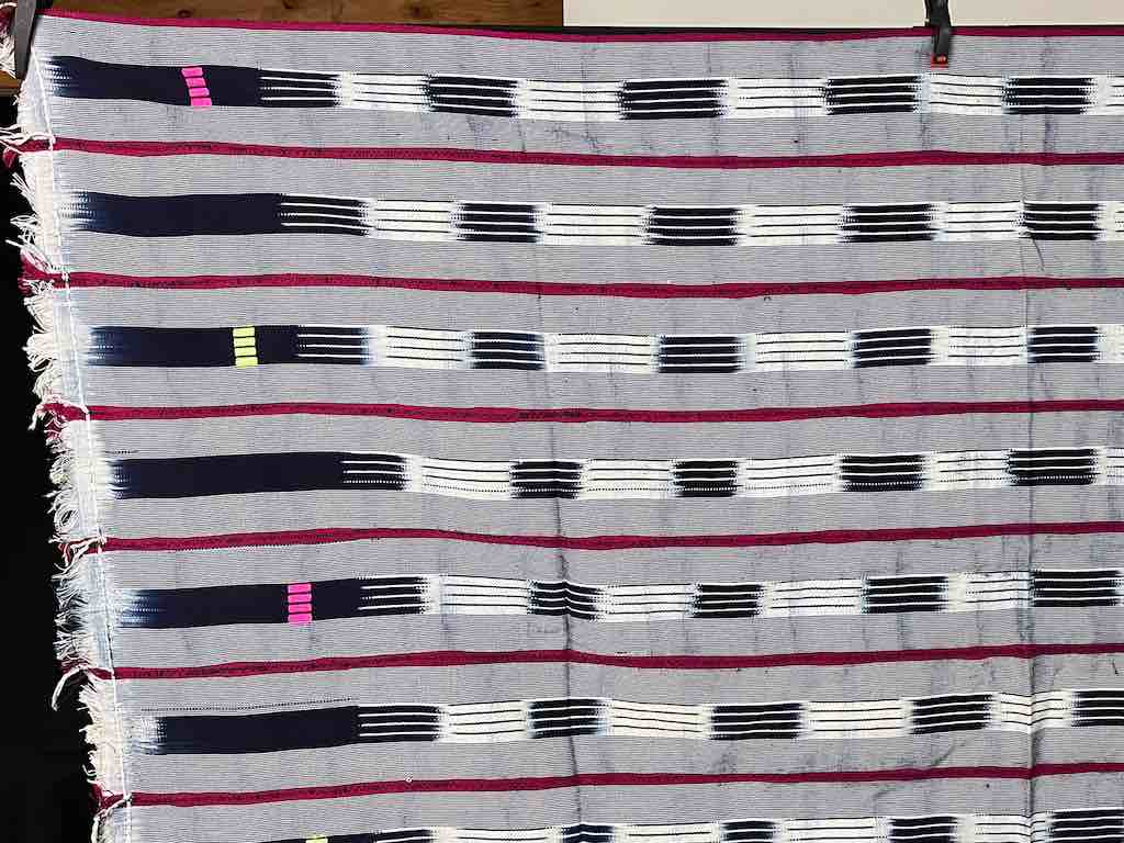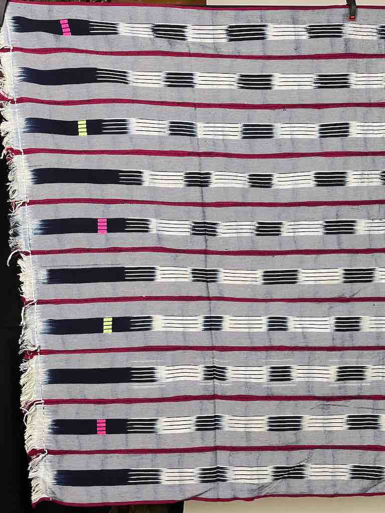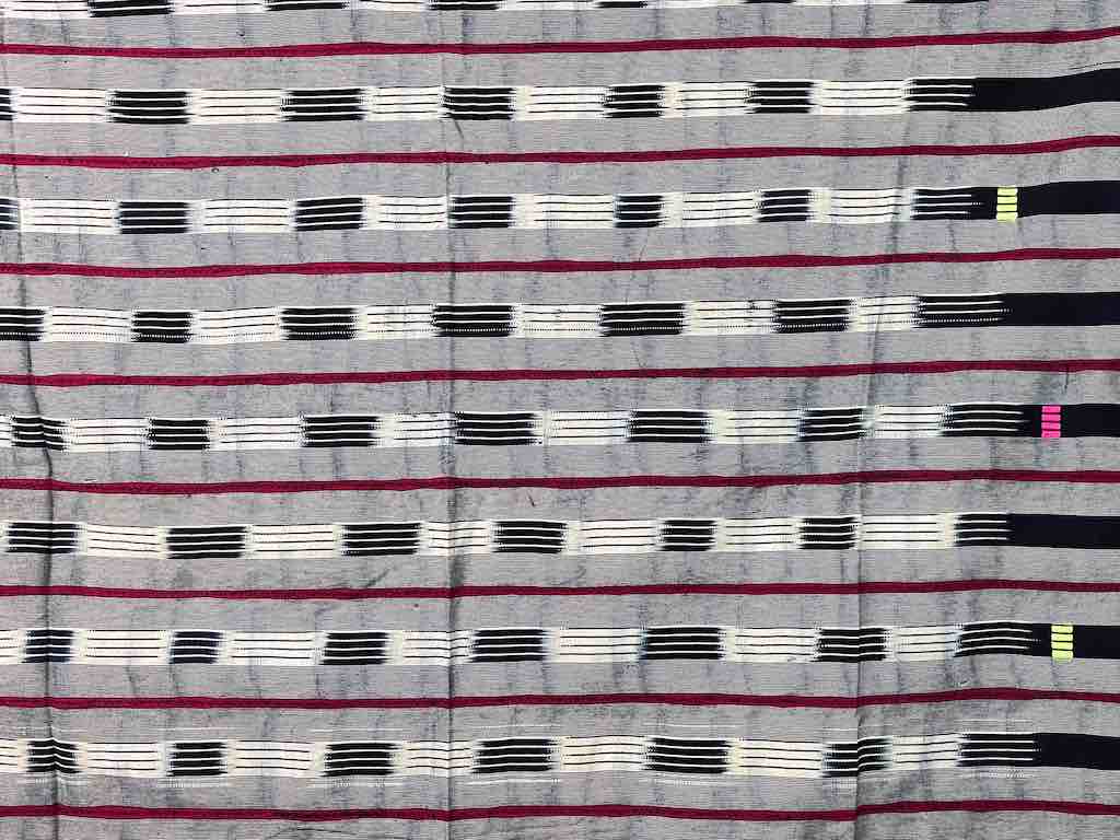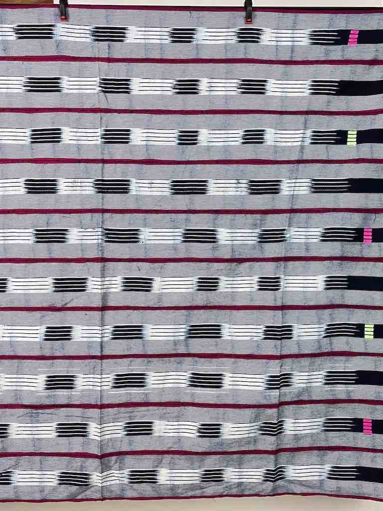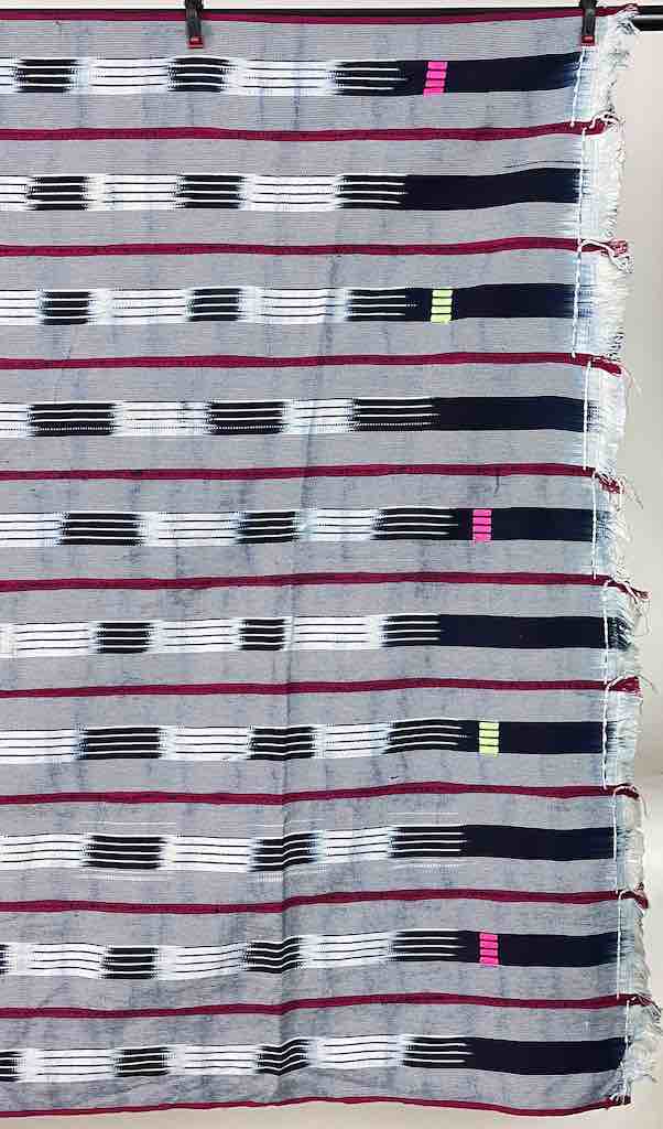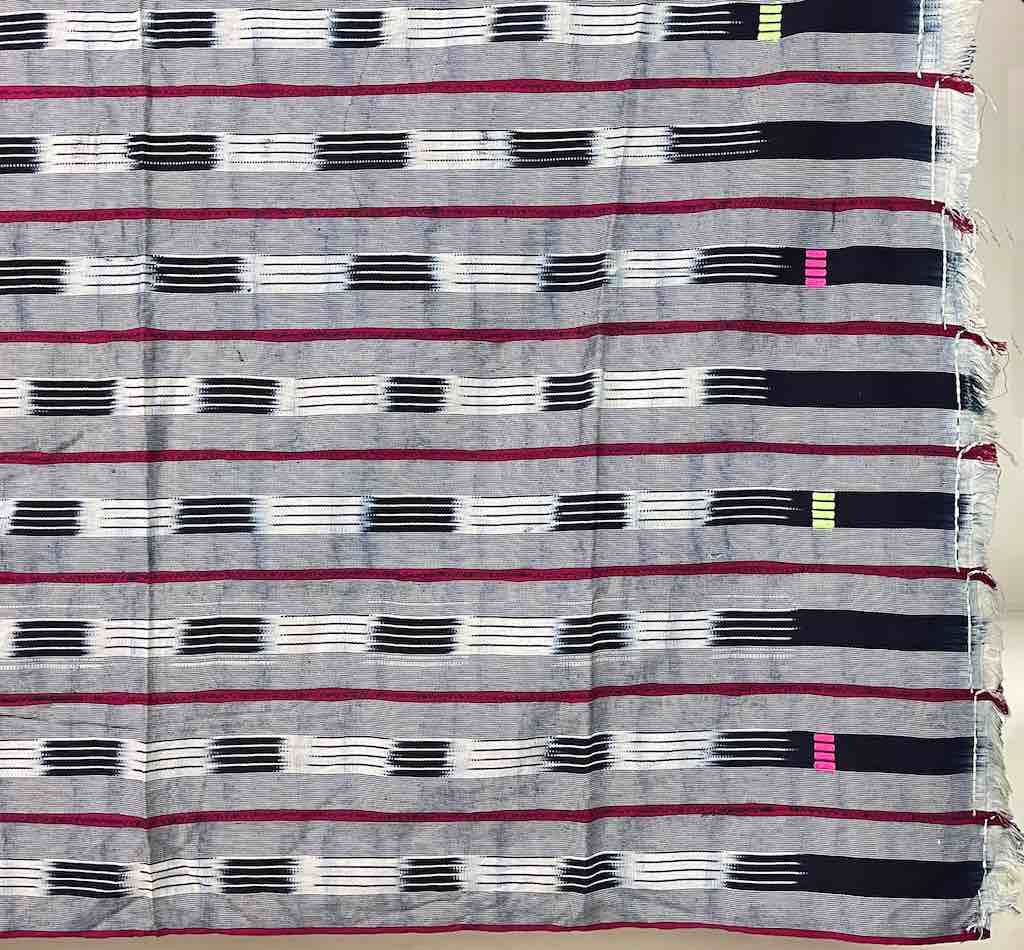These beautiful textiles were woven in Ivory Coast, West Africa by the Baule tribe to be used as clothing. Baule women wear them as a wraparound "skirt". Originally woven in pairs - one for a woman's waist, the other to tie her baby to her back, vintage pairs are hard to find as they wear differently; for both to survive intact is possible but not common.