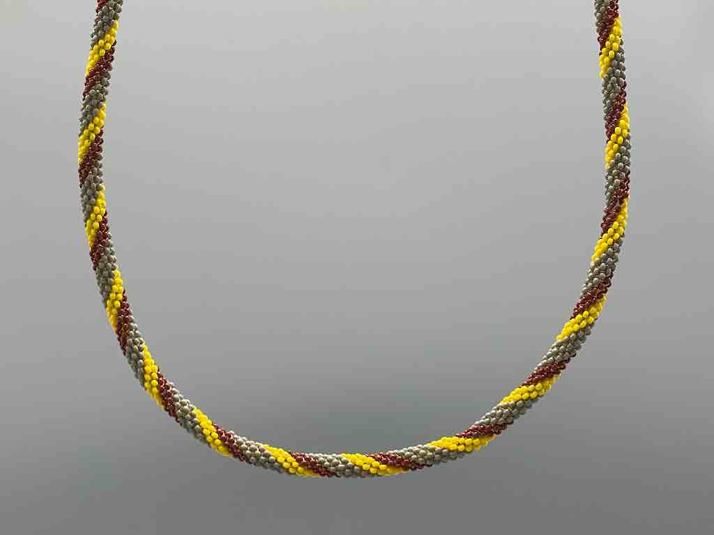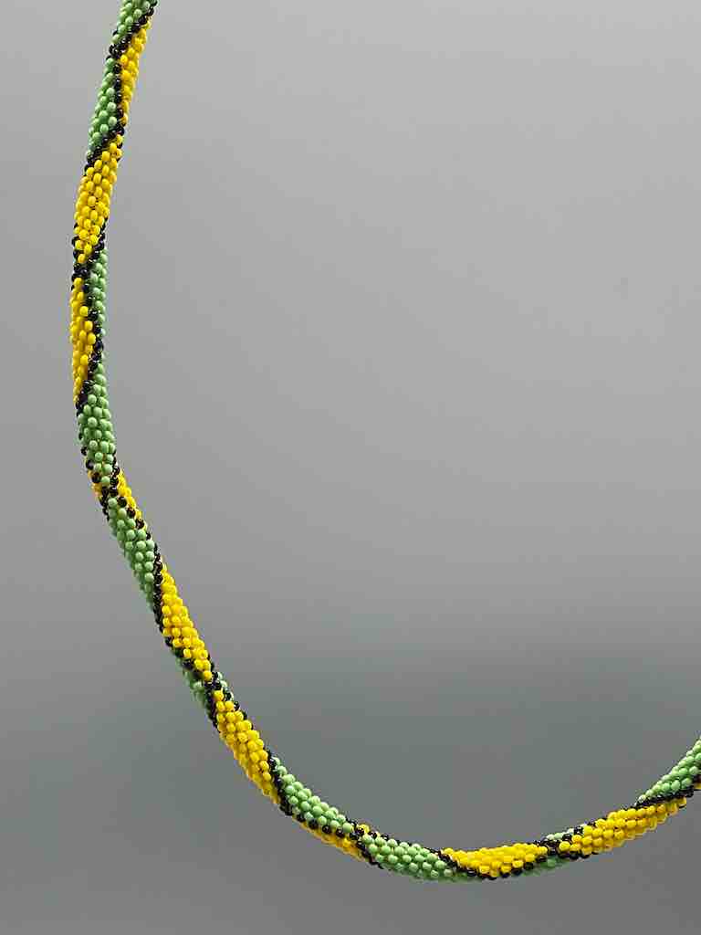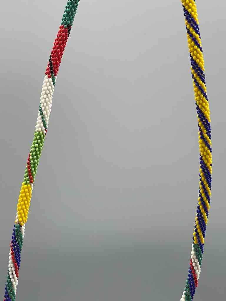 A wonderfully intricate beaded necklace with contrasting colors and patterns.