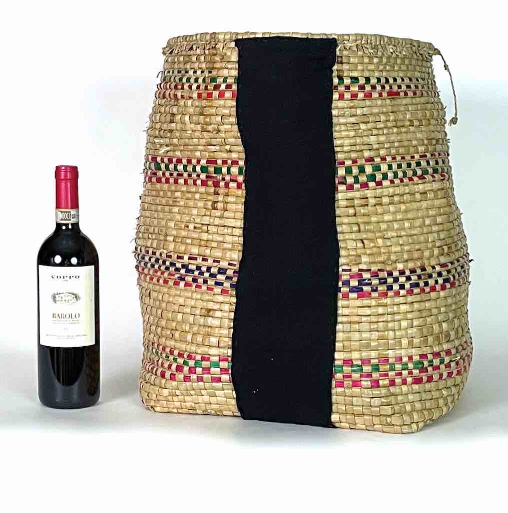 This flexible deep basket, handwoven by the women of the Mina tribe in coastal Benin, was made of the very plentiful lowland grass from the swampy delta area of Benin. We have added a strip of handwoven Black Tiv cloth from Nigeria to accent the beauty of this already exceptional basket. We sell full pieces of this cloth separately. This type of basket is as useful for us as they are for the people of Benin although we would be more likely to put a large plant in it and they would use it to transport and store food items.
