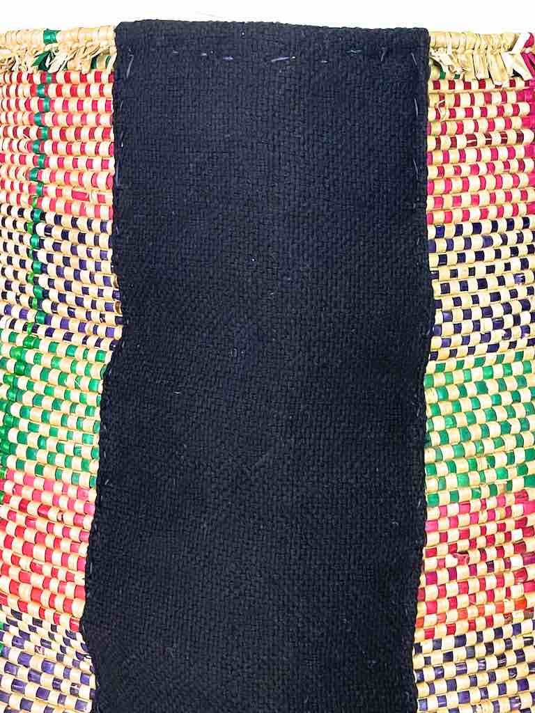 This flexible deep basket, handwoven by the women of the Mina tribe in coastal Benin, was made of the very plentiful lowland grass from the swampy delta area of Benin. We have added a strip of handwoven indigo Tiv cloth from Nigeria to accent the beauty of this already exceptional basket. This unique, traditional cloth was made by skilled weavers in Benue State. We sell full pieces of this cloth separately. This type of basket is as useful for us as they are for the people of Benin although we would be more likely to put a large plant in it and they would use it to transport and store food items.