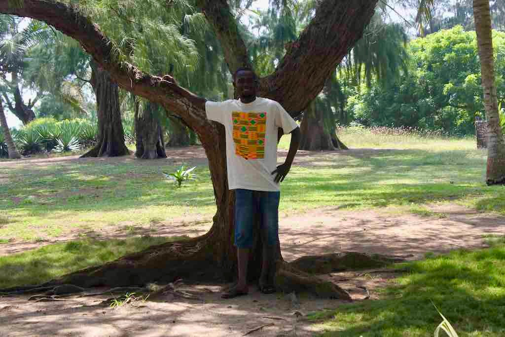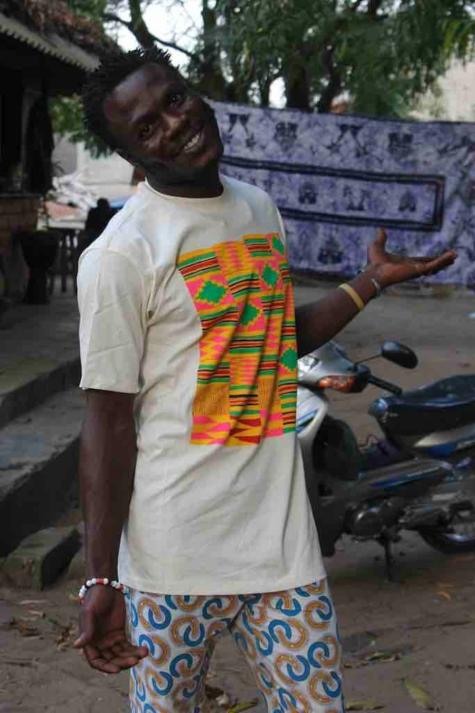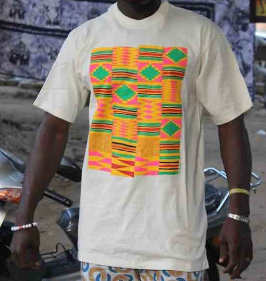 We asked a local Syracuse, NY T-shirt printer to copy a section of one of our genuine Ashanti Kente cloths onto 3 different color T-shirts: Black, White and Natural Cotton. We have limited sizes still available.