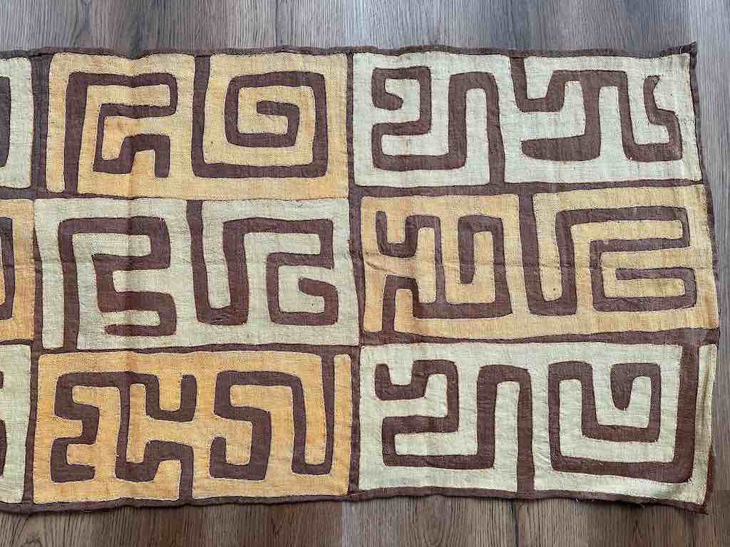 This type of Kuba cloth, known as "bushoong" is a durable fabric made of raffia: the background is a hand-woven black and features a zig zag central pattern with embroidered squares throughout. The zig zag is framed by natural straw-color and light brown geometric appliqué designs.