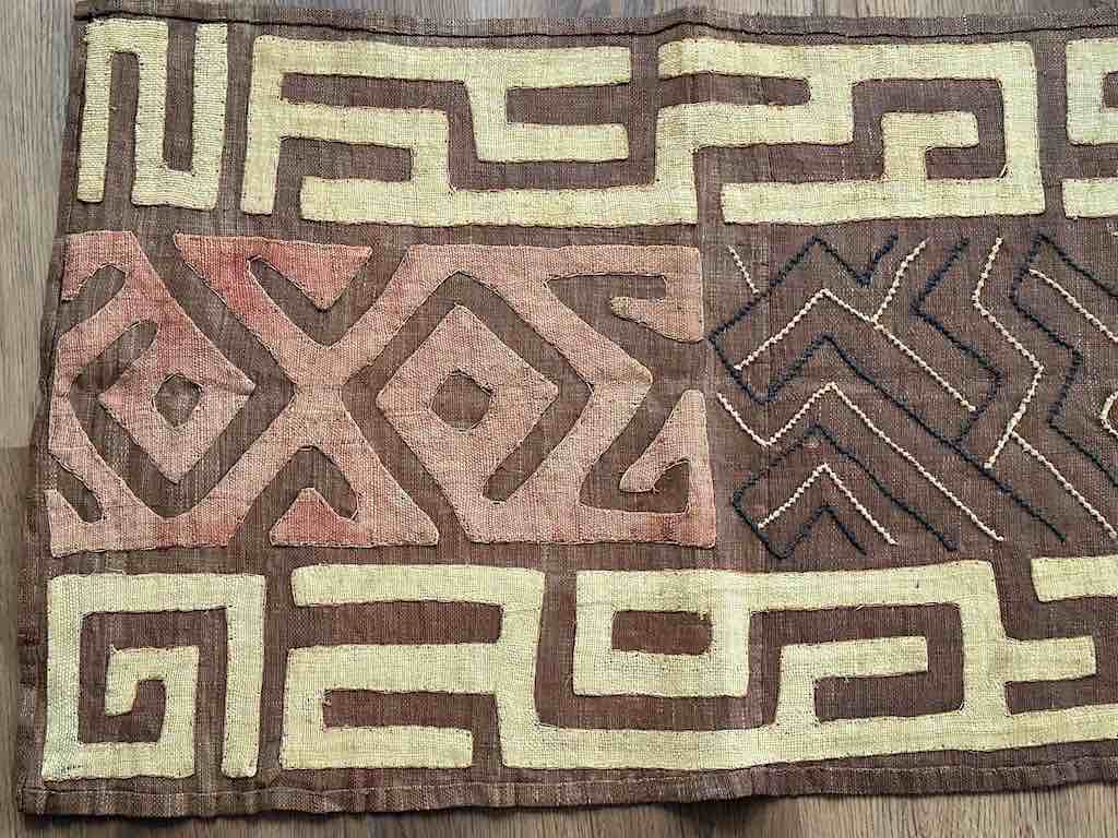This type of Kuba cloth, known as "bushoong" is a durable fabric made of raffia: the background is a hand-woven black and features a zig zag central pattern with embroidered squares throughout. The zig zag is framed by natural straw-color and light brown geometric appliqué designs.