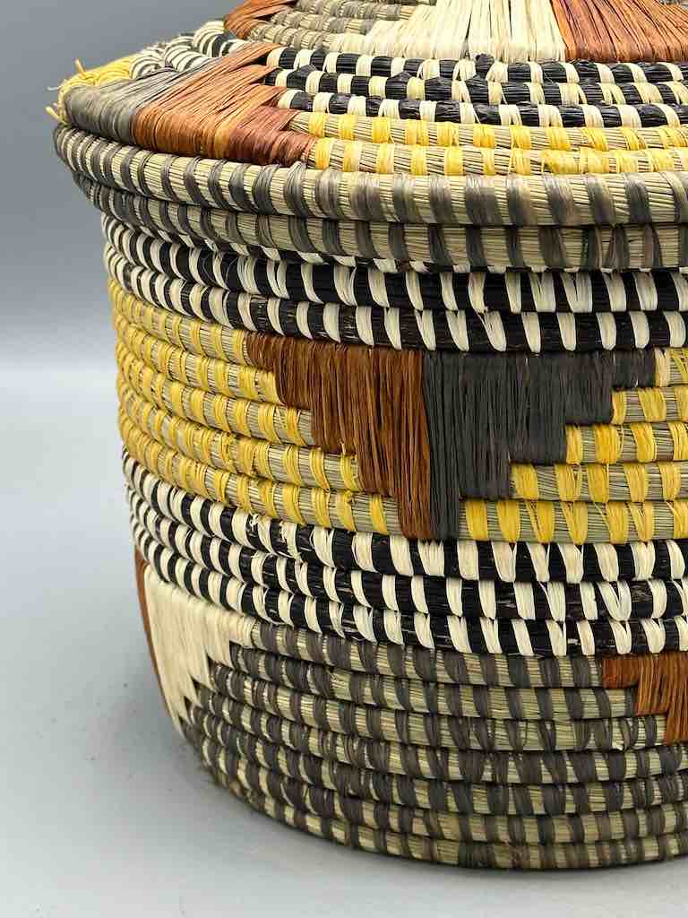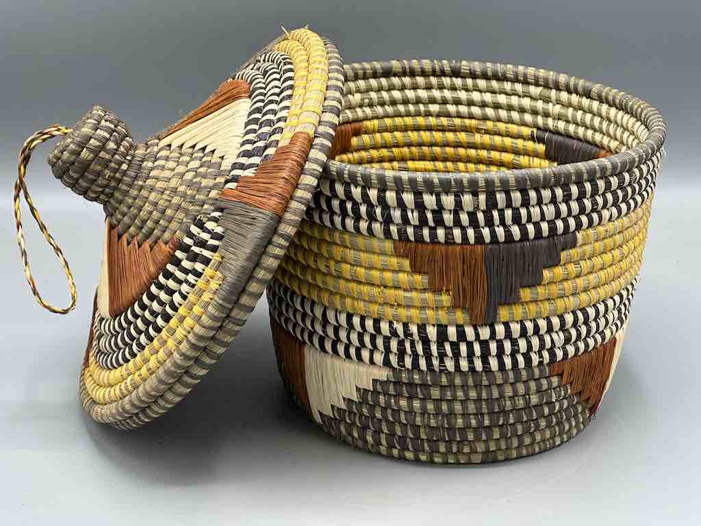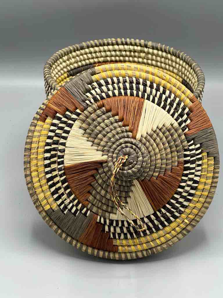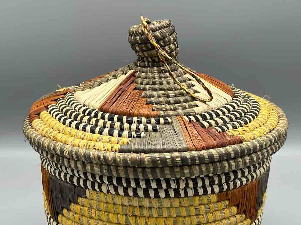 These Batwa baskets are unlike any other African basket. To the coiled grass bound by dyed raffia a supplementary raffia woven design is added to form this extraordinary basket. The Batwa - the Twa people, a “pygmy” people - live in the border area of southwestern Uganda, northwestern Rwanda and eastern Congo, in the area of the Ruwenzori Mountains, in the Bwindi Impenetrable Forest. They live among a native gorilla population just like we live among whitetail deer.
