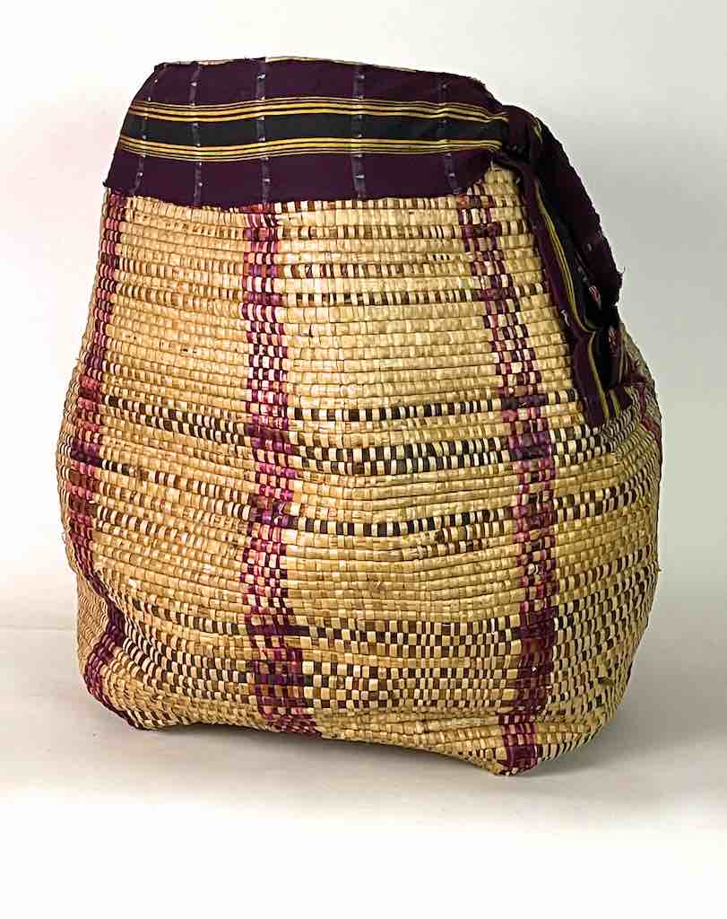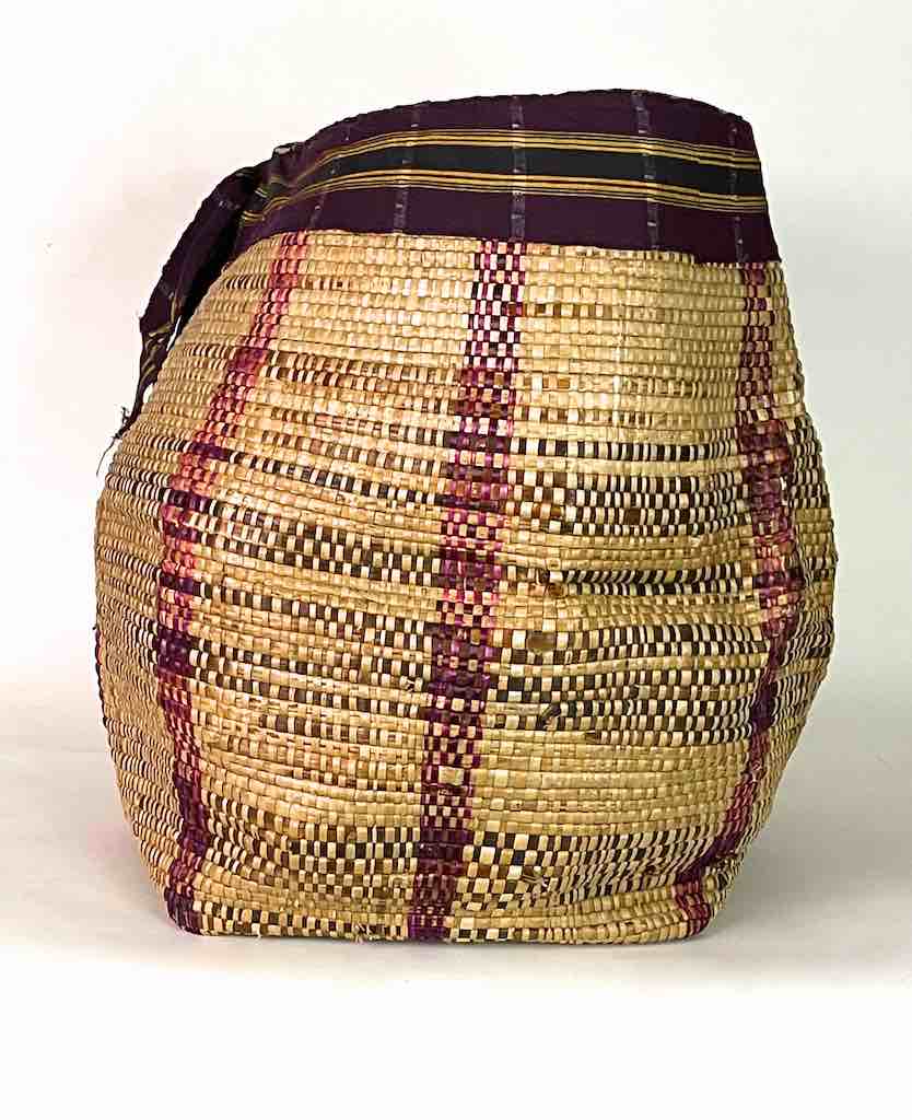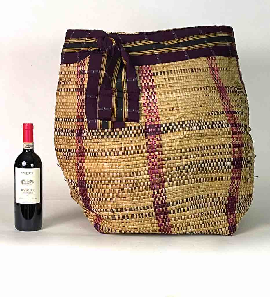 This large flexible deep basket, handwoven by the women of the Mina tribe in coastal Benin, was made of the very plentiful lowland grass from the swampy delta area of Benin. We have added a strip of handwoven aso oke cloth in a deep maroon color to accent the beauty of this already exceptional basket. This aso oke cloth was made by the skilled Yoruba weavers of Nigeria. We sell full pieces of this cloth separately. This type of basket is as useful for us as they are for the people of Benin although we would be more likely to put a large plant in it and they would use it to transport and store food items.