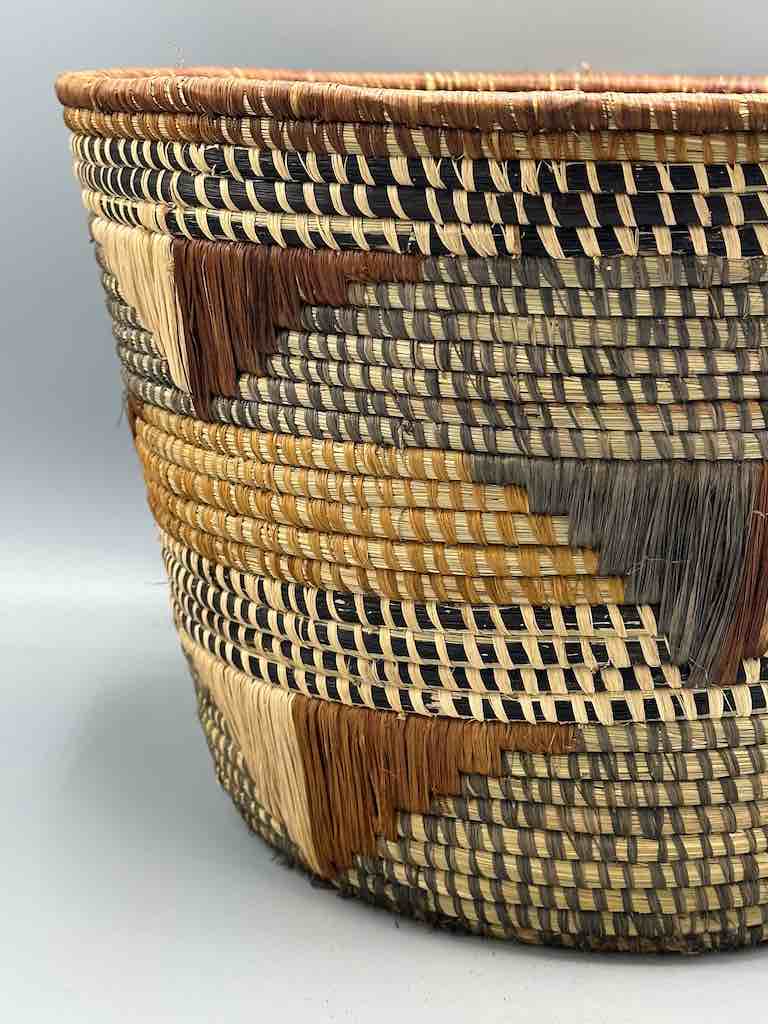 These Batwa baskets are unlike any other African basket. To the coiled grass construction a supplementary raffia woven design is added. The Batwa - the Twa people, a “pygmy” people - live in the border area of southwestern Uganda, northwestern Rwanda and eastern Congo, in the area of the Ruwenzori Mountains, in the Bwindi Impenetrable Forest. They live among a native gorilla population just like we live among whitetail deer.