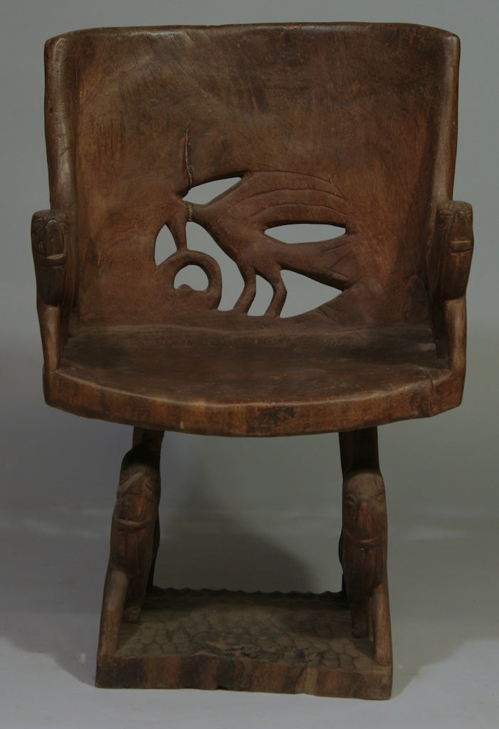 33″ (84 cm) tall x 21 1/4″ (54 cm) wide x 15″ (38 cm) seat height x 13″ (34 cm) seat depth. All 4 lions represented on this chair are the symbol of a former ahosu (king) of the Fon people, Glele. Rare, if not unique in Africa, the Fon have a strong sense of their royal heritage, not unlike the British. They know their royal lineage. Each king has his own exclusive symbol, immediately identifiable to all Fon people. Glele was the ahosu from 1858 to 1889.
