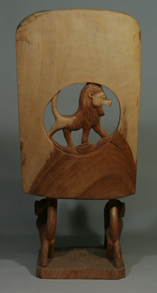 51 1/4″ tall (130 cm) x 21″ wide (53 cm) x 16 3/4″ seat height (42.5 cm) x 17″ seat depth (43 cm). All 4 lions represented on this chair are the symbol of a former ahosu (king) of the Fon people, Glele. Rare, if not unique in Africa, the Fon have a strong sense of their royal heritage, not unlike the British. They know their royal lineage. Each king has his own exclusive symbol, immediately identifiable to all Fon people. Glele was the ahosu from 1858 to 1889.