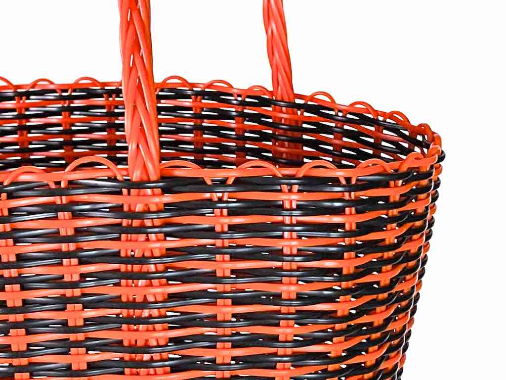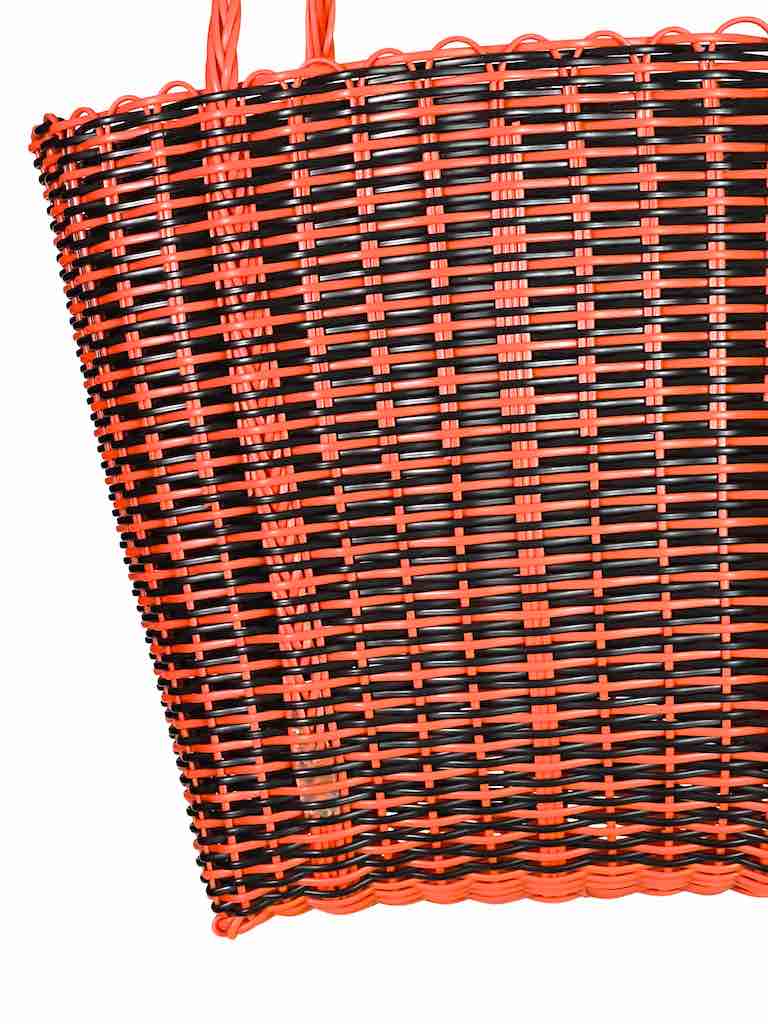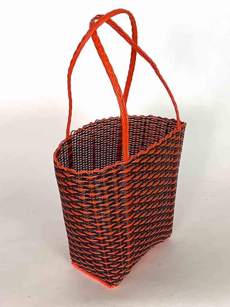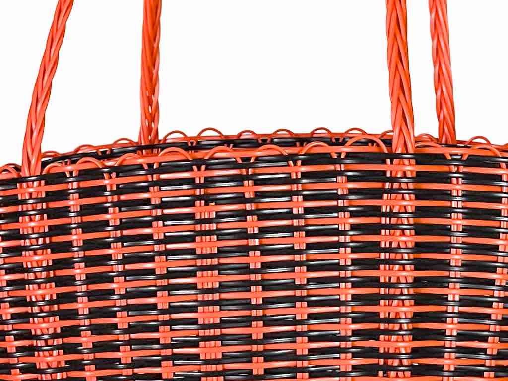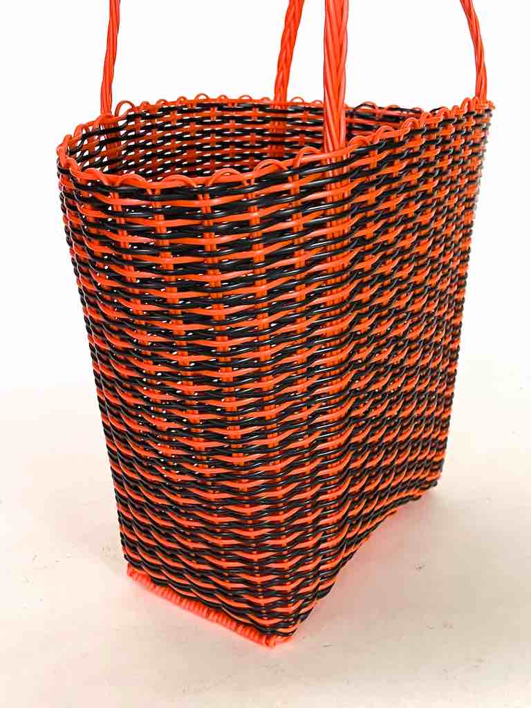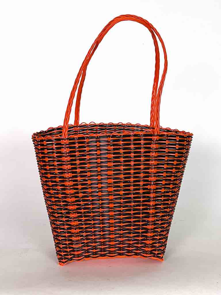 This deep, colorful hand-woven recycled plastic handbag is made to last. The handle is woven into the design of basket so that it extends around the bottom of the handbag in double support of the bag from below. This makes it unusually versatile as well as fashionable and stylish. This exceptionally sturdy tote is orange & black.