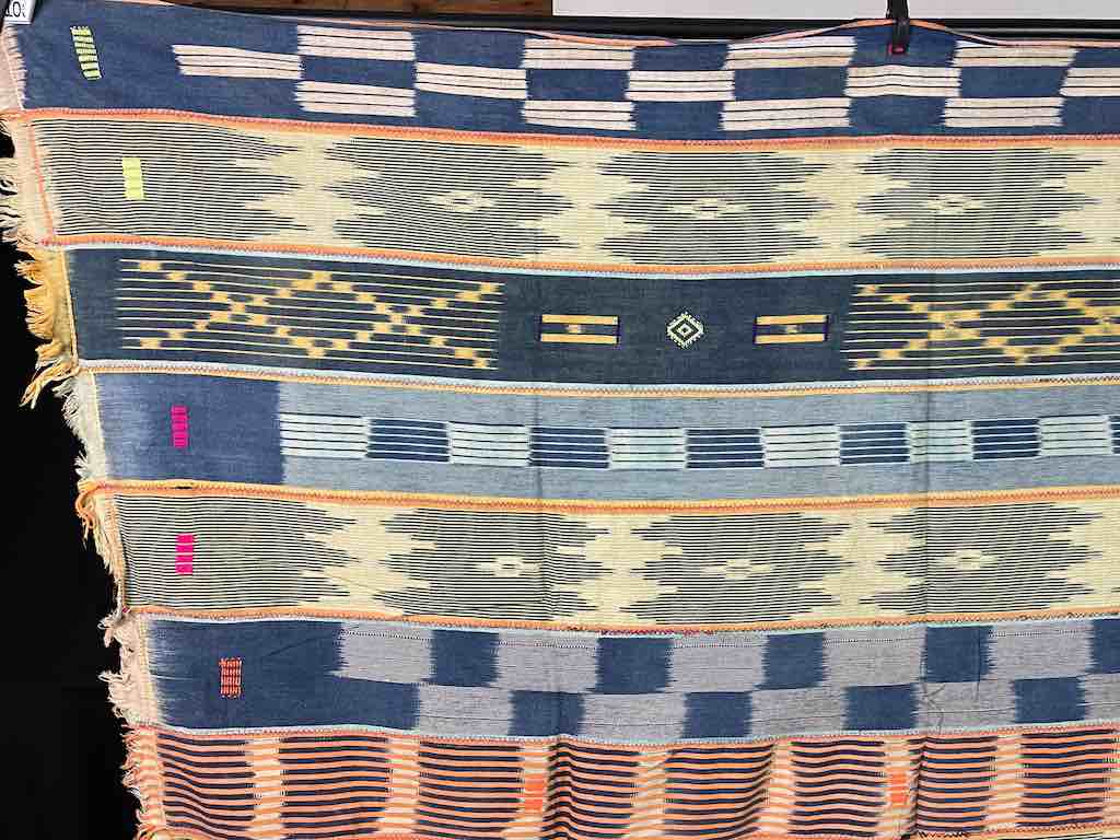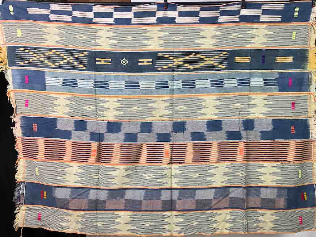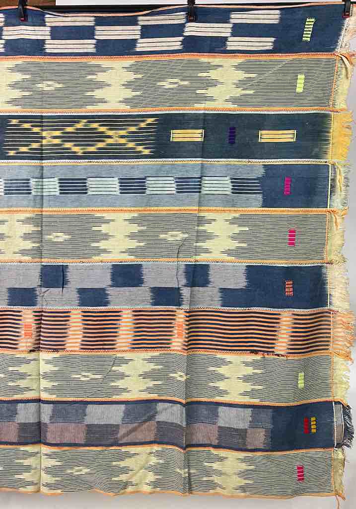 These beautiful textiles were woven in Ivory Coast, West Africa by the Baule tribe to be used as clothing. Baule women wear them as a wraparound "skirt". Originally woven in pairs - one for a woman's waist, the other to tie her baby to her back, vintage pairs are hard to find as they wear differently; for both to survive intact is possible but not common.