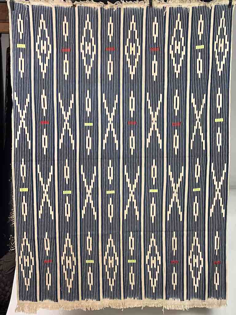 These beautiful textiles were woven in Ivory Coast, West Africa by the Baule tribe to be used as clothing. Baule women wear them as a wraparound "skirt". Originally woven in pairs - one for a woman's waist, the other to tie her baby to her back, vintage pairs are hard to find as they wear differently; for both to survive intact is possible but not common.