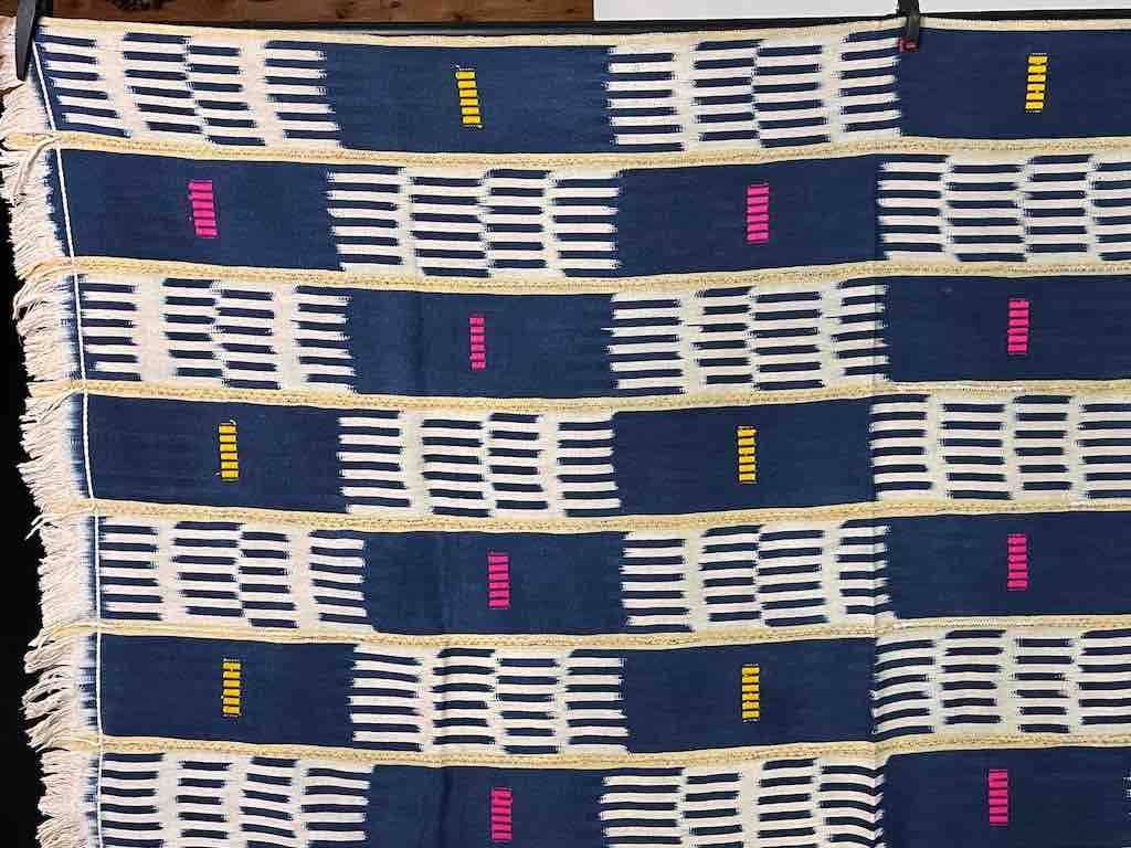 These beautiful textiles were woven in Ivory Coast, West Africa by the Baule tribe to be used as clothing. Baule women wear them as a wraparound "skirt". Originally woven in pairs - one for a woman's waist, the other to tie her baby to her back, vintage pairs are hard to find as they wear differently; for both to survive intact is possible but not common.