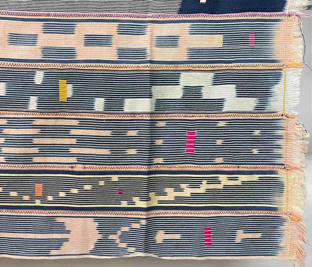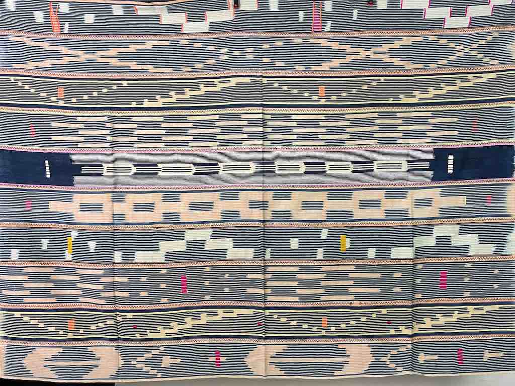 These beautiful textiles were woven in Ivory Coast, West Africa by the Baule tribe to be used as clothing. Baule women wear them as a wraparound "skirt". Originally woven in pairs - one for a woman's waist, the other to tie her baby to her back, vintage pairs are hard to find as they wear differently; for both to survive intact is possible but not common.