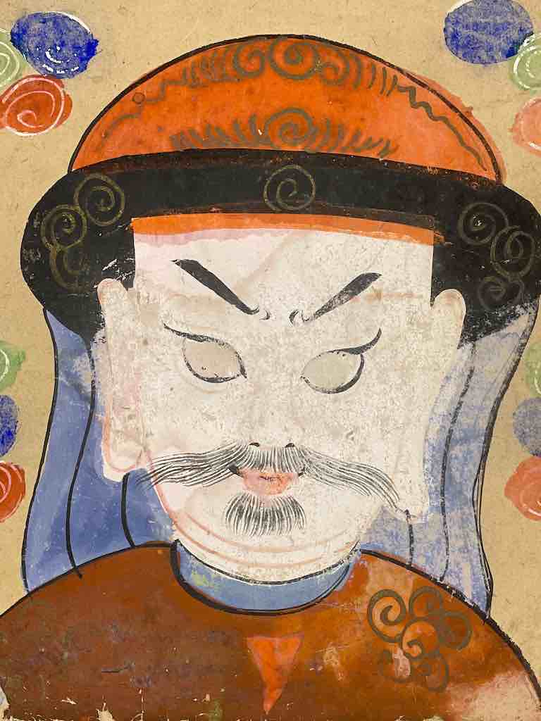 This very old portrait of a male deity in the Tao religion of the Dao (aka Yao) people of Viet Nam was painted on rice paper and would often consist of several layers of paper. This "mask" was made for and actually worn by a priest in ritual ceremonies. The name of the owner of the mask appears on the back of the mask.