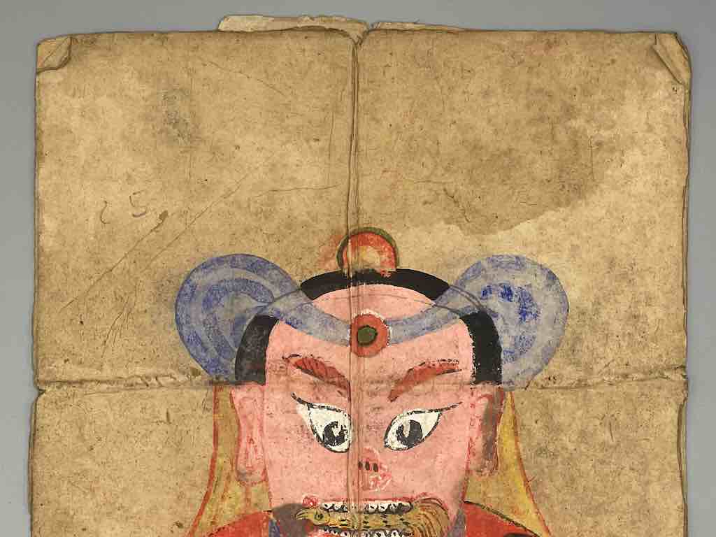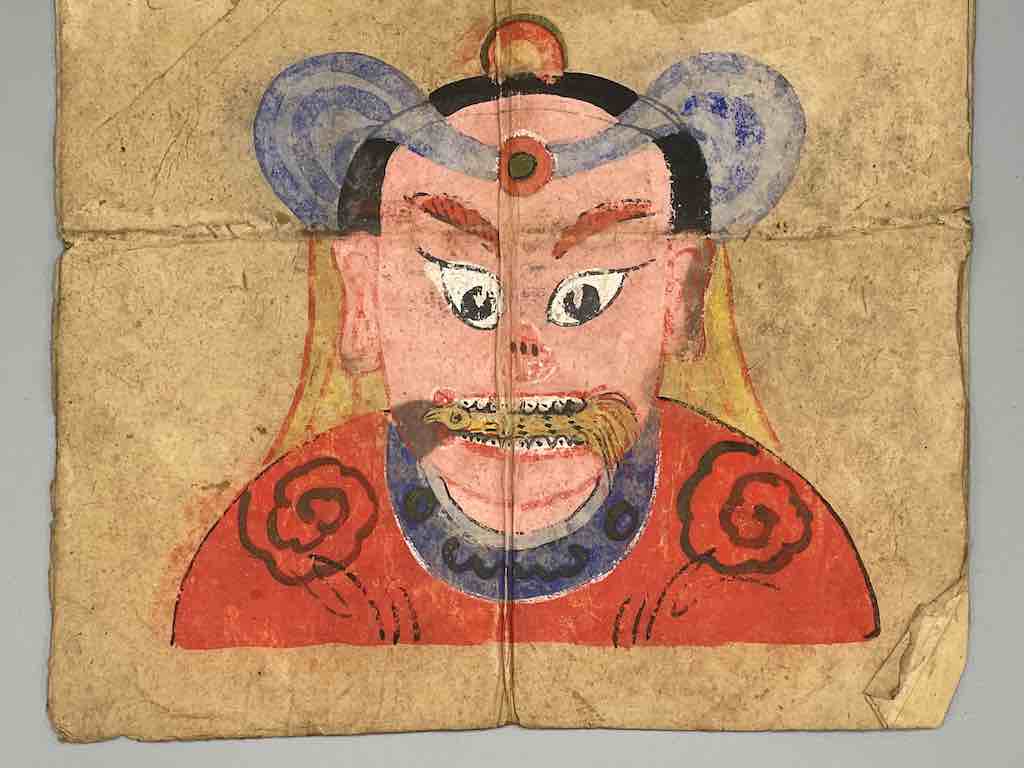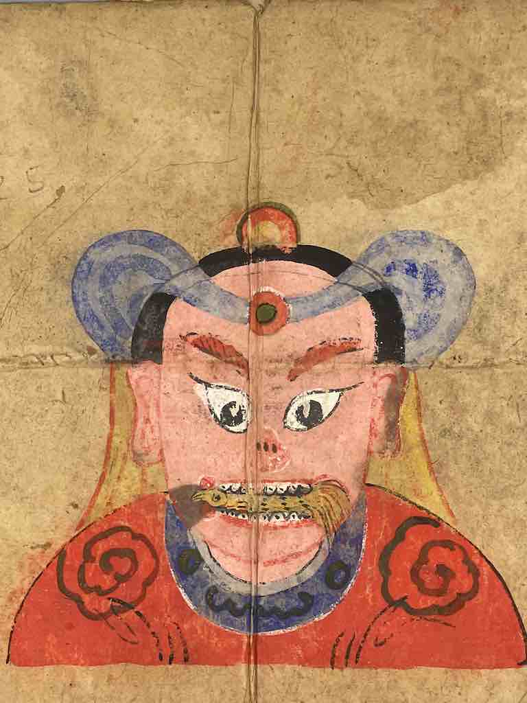 This very old portrait of a male deity in the Tao religion of the Dao (aka Yao) people of Viet Nam was painted on rice paper and would often consist of several layers of paper. This "mask" was made for and actually worn by a priest in ritual ceremonies. The name of the owner of the mask appears on the back of the mask.