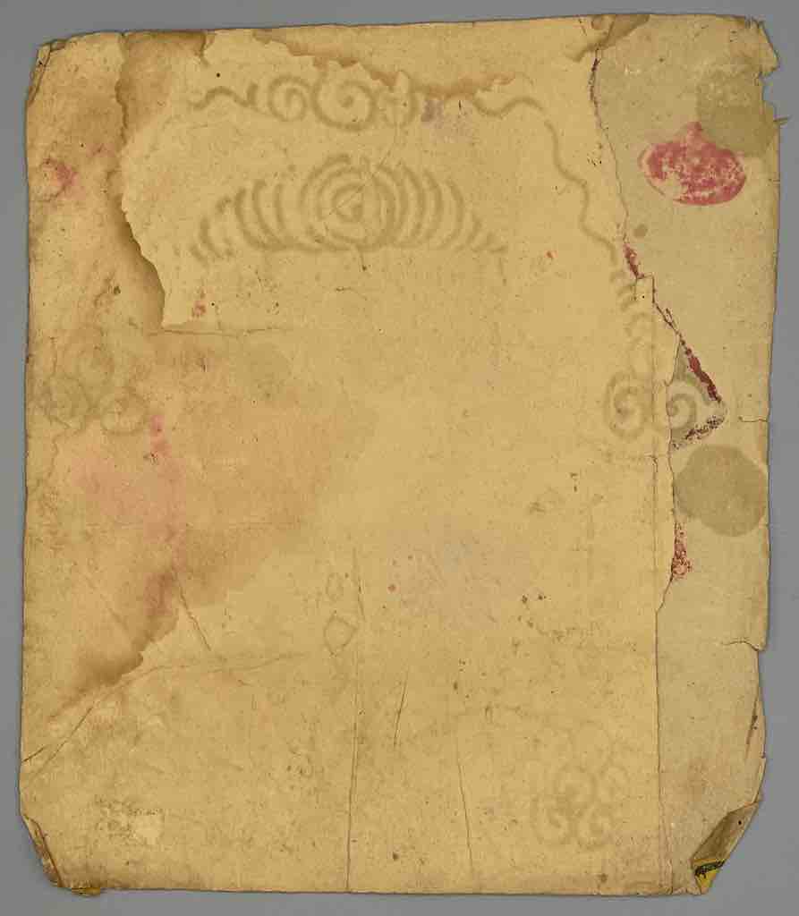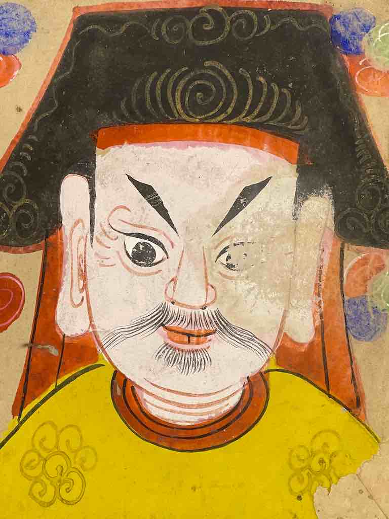 This very old portrait of a male deity in the Tao religion of the Dao (aka Yao) people of Viet Nam was painted on rice paper and would often consist of several layers of paper. This "mask" was made for and actually worn by a priest in ritual ceremonies. The name of the owner of the mask appears on the back of the mask.