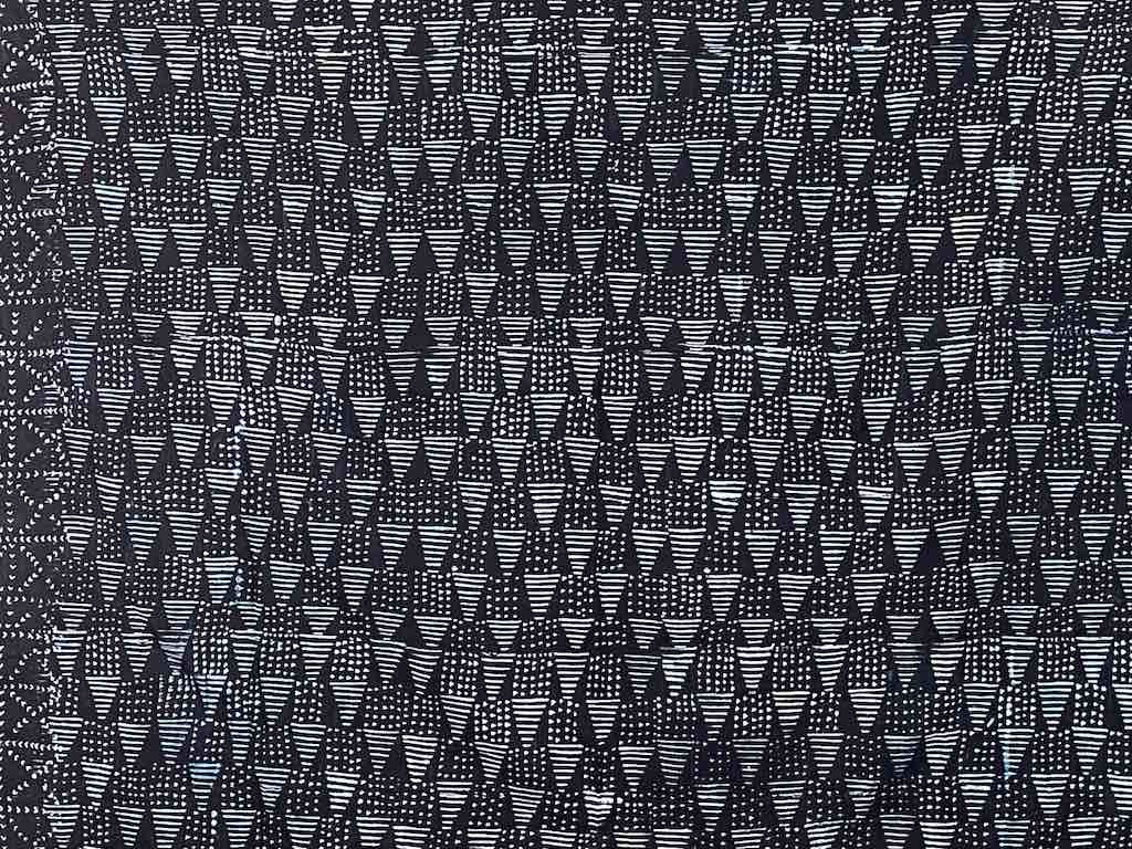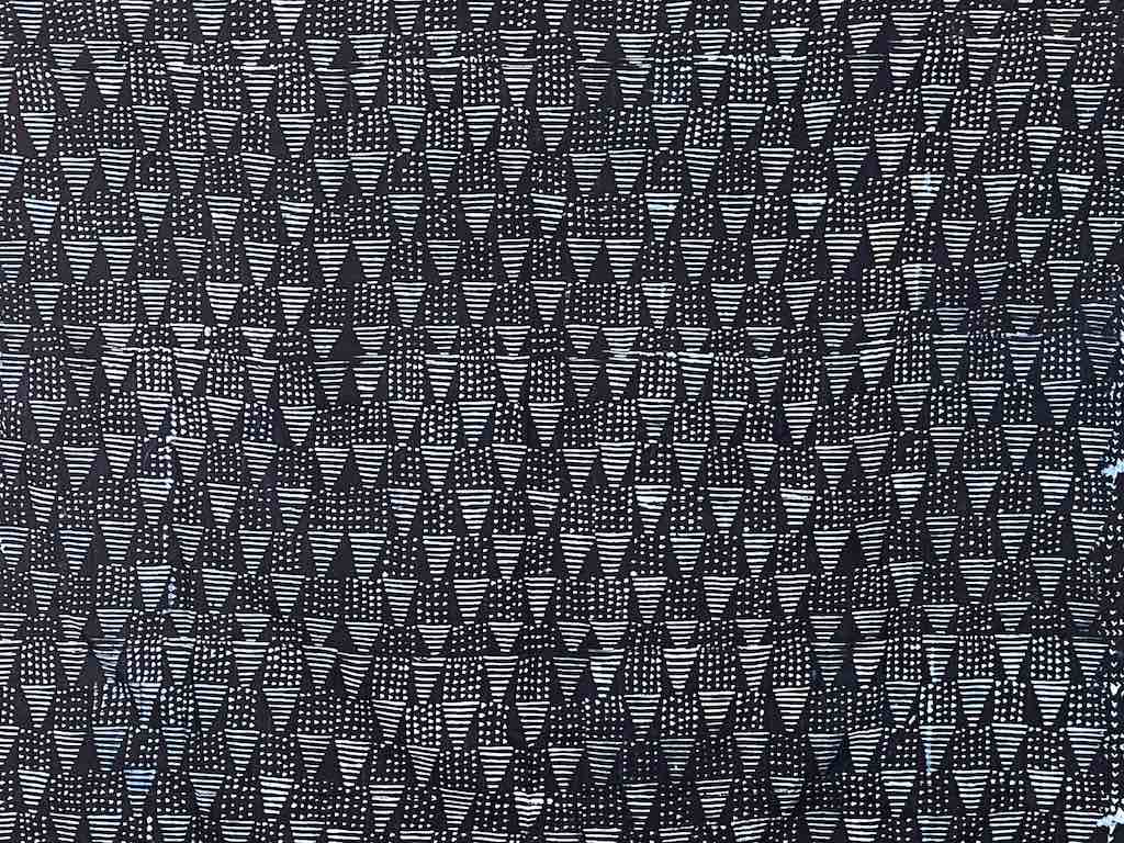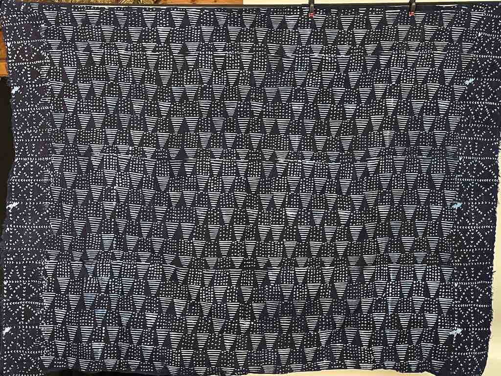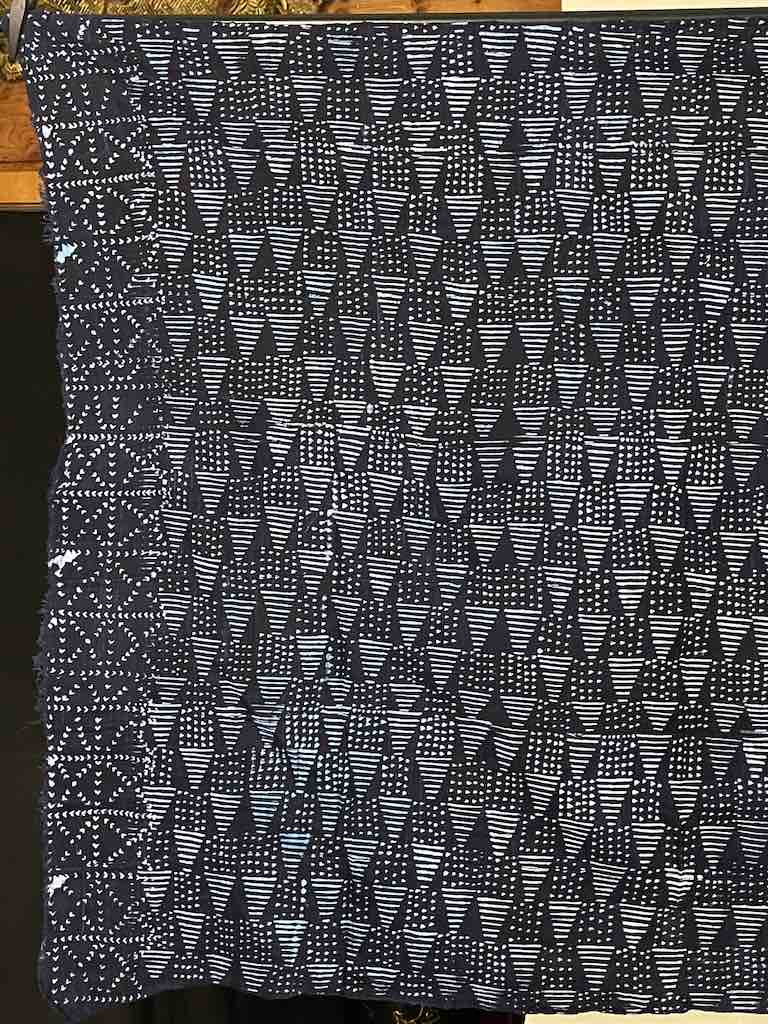 This textile is hand spun and used by Fulani people in Mali, West Africa. After the base textile is woven of cotton thread the completed textile is then dyed using natural indigo dyes. The pattern is accompished using a resist technique. These textiles are referred to as "wrappers" since women wrap them around their waist as skirts.