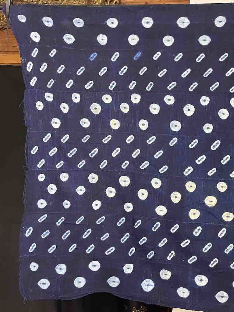 This textile is hand spun and used by Fulani people in Mali, West Africa. After the base textile is woven of cotton thread the completed textile is then dyed using natural indigo dyes. The pattern is accompished using a resist technique. These textiles are referred to as "wrappers" since women wrap them around their waist as skirts.