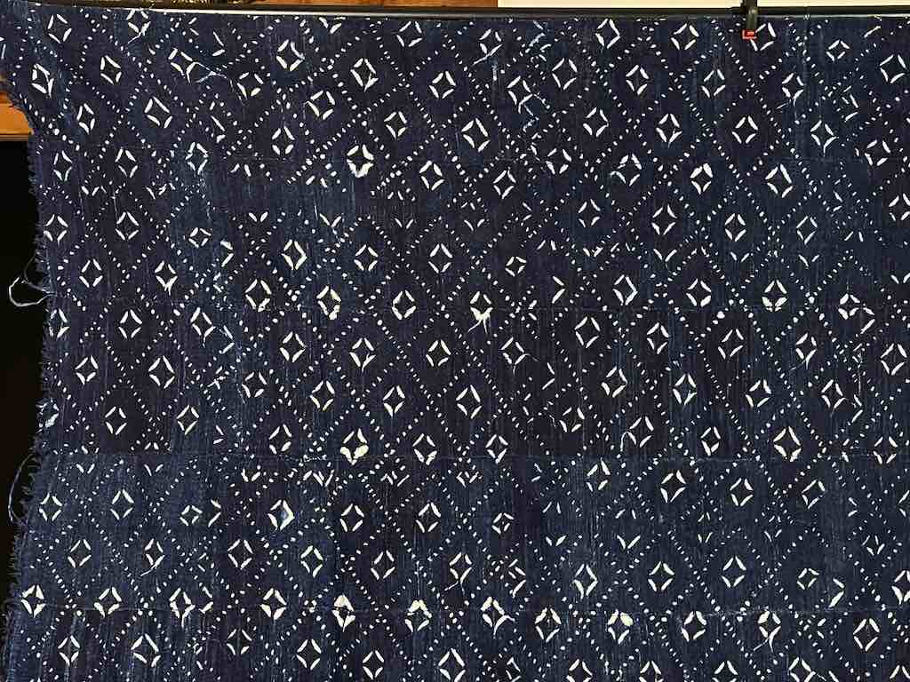 This textile is hand spun and used by Fulani people in Mali, West Africa. After the base textile is woven of cotton thread the completed textile is then dyed using natural indigo dyes. The pattern is accompished using a resist technique. These textiles are referred to as "wrappers" since women wrap them around their waist as skirts.